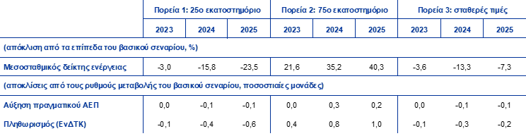Σημειώσεις: Στην παρούσα ανάλυση ευαισθησίας χρησιμοποιείται ένας μεσοσταθμικός δείκτης τιμών της ενέργειας, ο οποίος συνδυάζει τις τιμές των συμβολαίων μελλοντικής εκπλήρωσης για το πετρέλαιο και για το φυσικό αέριο. Το 25ο και το 75ο εκατοστημόριο αναφέρονται στις πυκνότητες πιθανότητας μηδενικού κινδύνου με βάση τα δικαιώματα προαίρεσης για τις τιμές του πετρελαίου και του φυσικού αερίου στις 23 Μαΐου 2023. Οι σταθερές τιμές του πετρελαίου και του φυσικού αερίου λαμβάνουν την αντίστοιχη αξία την ίδια ημερομηνία. Οι μακροοικονομικές επιπτώσεις αναφέρονται ως μέσοι όροι διαφόρων μακροοικονομικών υποδειγμάτων εμπειρογνωμόνων της ΕΚΤ και του Ευρωσυστήματος.