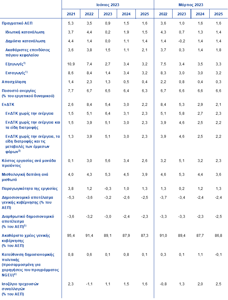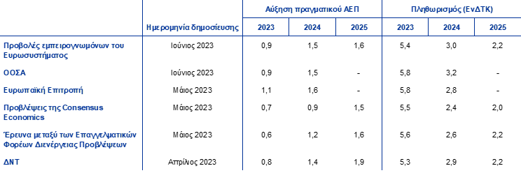 Πηγές: ΟΟΣΑ, June 2023 Economic Outlook 113, 7 Ιουνίου 2023· Οικονομικές Προβλέψεις της Ευρωπαϊκής Επιτροπής, Άνοιξη 2023, 15 Μαΐου 2023· Προβλέψεις της Consensus Economics, 11 Μαΐου 2023 (τα στοιχεία για το 2025 προέρχονται από την έρευνα του Απριλίου 2023)· Έρευνα της ΕΚΤ μεταξύ των Επαγγελματικών Φορέων Διενέργειας Προβλέψεων, 5 Μαΐου 2023· ΔΝΤ, World Economic Outlook, 11 Απριλίου 2023.