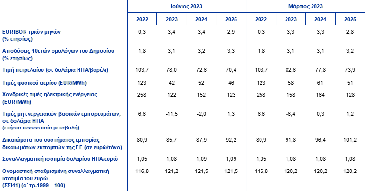 Σε σύγκριση με τις προβολές του Μαρτίου 2023, οι τεχνικές υποθέσεις περιλαμβάνουν ελαφρώς υψηλότερα επιτόκια, χαμηλότερες τιμές του πετρελαίου, σημαντικά χαμηλότερες χονδρικές τιμές του φυσικού αερίου και της ηλεκτρικής ενέργειας και ανατίμηση του ευρώ. Οι τεχνικές υποθέσεις που αφορούν τα επιτόκια και τις τιμές των βασικών εμπορευμάτων βασίζονται στις προσδοκίες της αγοράς σύμφωνα με στοιχεία έως και τις 23 Μαΐου 2023. Τα βραχυπρόθεσμα επιτόκια αφορούν το EURIBOR τριών μηνών και οι προσδοκίες της αγοράς προκύπτουν από τα επιτόκια των συμβολαίων μελλοντικής εκπλήρωσης, ενώ οι αποδόσεις των δεκαετών κρατικών ομολόγων χρησιμοποιούνται ως προσεγγιστική μεταβλητή για τα μακροπρόθεσμα επιτόκια.[4] Τόσο τα βραχυπρόθεσμα όσο και τα μακροπρόθεσμα επιτόκια έχουν αυξηθεί ελαφρώς από την τελευταία ημερομηνία συμπερίληψης στοιχείων για τις προβολές του Μαρτίου 2023 και, σε σχέση με αυτές τις προβολές, η πορεία τους έχει αναθεωρηθεί προς τα πάνω κατά περίπου 10 μονάδες βάσης λόγω των περαιτέρω αυξήσεων των επιτοκίων πολιτικής της ΕΚΤ.