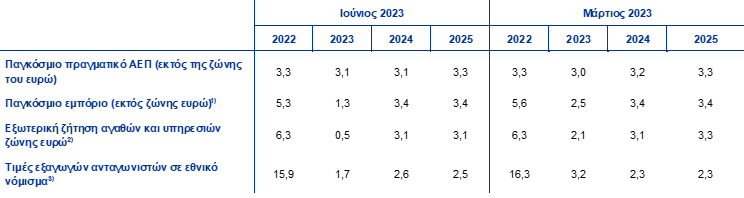 Η παγκόσμια οικονομία ξεκίνησε το έτος δυναμικά και αναμένεται να μεγεθυνθεί με συγκρατημένο ρυθμό στη διάρκεια του χρονικού ορίζοντα προβολής, παρουσιάζοντας κάποια επιτάχυνση το 2025. Ο ρυθμός αύξησης του παγκόσμιου ΑΕΠ (χωρίς τη ζώνη του ευρώ) ήταν απροσδόκητα υψηλός το α΄ τρίμηνο του 2023, χάρη στις καλύτερες από ό,τι αναμενόταν επιδόσεις της κινεζικής οικονομίας, η οποία μετά την άρση των πανδημικών περιορισμών ανέκαμψε νωρίτερα και εντονότερα από ό,τι αναμενόταν, αλλά και επίσης της οικονομίας των ΗΠΑ σε συνάφεια με την ανθεκτικότητα της αγοράς εργασίας. Οι επιπτώσεις από τα προβλήματα που αντιμετώπισε ο αμερικανικός τραπεζικός τομέας στις αρχές Μαρτίου οδήγησαν σε μια σύντομη περίοδο έντονων πιέσεων στις παγκόσμιες χρηματοπιστωτικές αγορές. Έκτοτε, ωστόσο, οι περισσότερες κατηγορίες περιουσιακών στοιχείων ανέκτησαν τις απώλειές τους παρά την εμμένουσα αβεβαιότητα. Η παγκόσμια οικονομία (εκτός της ζώνης του ευρώ) αναμένεται, βάσει των προβολών, να μεγεθυνθεί κατά 3,1% το τρέχον και το επόμενο έτος και κατά 3,3% το 2025. Οι προοπτικές για την ανάπτυξη παραμένουν σε γενικές γραμμές αμετάβλητες σε σύγκριση με τις προβολές του Μαρτίου 2023.