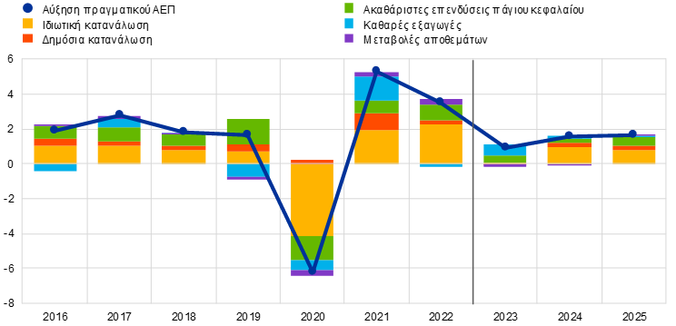 Μεσοπρόθεσμα, ο ρυθμός αύξησης του ΑΕΠ αναμένεται, βάσει των προβολών, να επιταχυνθεί περαιτέρω, υποβοηθούμενος από την περαιτέρω αύξηση του πραγματικού εισοδήματος και την ενίσχυση της εξωτερικής ζήτησης, παρά την αρνητική επίδραση από τις δυσμενέστερες συνθήκες χρηματοδότησης και την πιο περιοριστική κατεύθυνση της δημοσιονομικής πολιτικής. Η αύξηση του πραγματικού ΑΕΠ αναμένεται να ενισχυθεί σε όλη τη διάρκεια του 2023 και να σταθεροποιηθεί σε γενικές γραμμές το 2024-25, καταγράφοντας τριμηνιαίους ρυθμούς γύρω στο 0,4%. Πέρα από την εξομάλυνση των διαταραχών στην πλευρά της προσφοράς και την προνοητική συμπεριφορά που συνδέεται με την αβεβαιότητα, η ανάπτυξη αναμένεται επίσης να στηριχθεί σημαντικά από την υποχώρηση των πληθωριστικών πιέσεων, σε ένα περιβάλλον σταθερής αύξησης της απασχόλησης και του εισοδήματος από εργασία, επιτρέποντας τη συνεχή ανάκαμψη του πραγματικού διαθέσιμου εισοδήματος και της κατανάλωσης. Ωστόσο, η ώθηση από αυτούς τους ευνοϊκούς παράγοντες θα μετριαστεί από την αυστηροποίηση των συνθηκών χρηματοδότησης, την προηγούμενη ανατίμηση του ευρώ και τη σταδιακή άρση της δημοσιονομικής στήριξης.