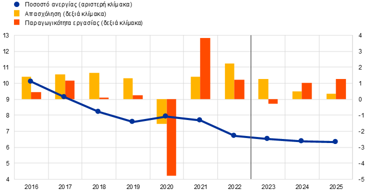 Η αγορά εργασίας αναμένεται, βάσει των προβολών, να εξακολουθήσει να είναι εύρωστη και να χαρακτηρίζεται από στενότητα στη διάρκεια του χρονικού ορίζοντα προβολής (Διάγραμμα 3). Η απασχόληση αυξήθηκε έντονα το α΄ τρίμηνο του 2023, κατά 0,6% σε σύγκριση με το προηγούμενο τρίμηνο, παρά την ελαφρά υποχώρηση του πραγματικού ΑΕΠ. Η αύξηση οφειλόταν κυρίως στην έντονη αύξηση του εργατικού δυναμικού. Η απασχόληση αναμένεται να αυξηθεί κατά 1,3% το 2023 αλλά με βραδύτερους ρυθμούς κατά το υπόλοιπο του χρονικού ορίζοντα προβολής, που θα φθάσουν σε 0,4% έως το 2025. Το ποσοστό ανεργίας αναμένεται, βάσει των προβολών, να μειωθεί περαιτέρω από ένα ήδη ιστορικά χαμηλό επίπεδο και να διαμορφωθεί σε 6,3% το 2025. Οι μέσες πραγματικές ώρες εργασίας ανά απασχολούμενο αναμένεται, βάσει των προβολών, να αυξηθούν περαιτέρω στη διάρκεια του χρονικού ορίζοντα προβολής – σε αντίθεση με την καθοδική τάση που είχαν παρουσιάσει τα έτη πριν από την πανδημική κρίση – αλλά προβλέπεται ότι θα παραμείνουν κάτω από το προ της κρίσης επίπεδο το δ΄ τρίμηνο του 2025. Ο ρυθμός αύξησης της παραγωγικότητας, ο οποίος επιβραδύνεται έντονα τα τελευταία τρίμηνα και διαμορφώθηκε σε -0,6% το α΄ τρίμηνο του 2023, αναμένεται, βάσει των προβολών, να φθάσει στο χαμηλότερο σημείο του το τρέχον έτος και στη συνέχεια να ανακάμψει σε επίπεδα υψηλότερα από τον ιστορικό μέσο όρο του το 2024 και το 2025.