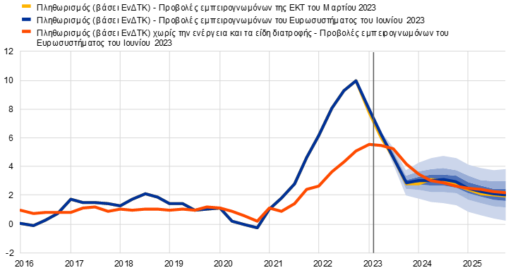 Σημειώσεις: Η κάθετη γραμμή αντιστοιχεί στην έναρξη του τρέχοντος χρονικού ορίζοντα προβολής. Τα διαστήματα που παρουσιάζονται γύρω από τις κεντρικές προβολές βασίζονται σε προηγούμενα σφάλματα των προβολών, μετά τη διόρθωση ακραίων παρατηρήσεων. Τα περιθώρια, από τα πιο σκούρα έως τα πιο ανοιχτά, απεικονίζουν τις πιθανότητες 30%, 60% και 90% σύμφωνα με τις οποίες το επίπεδο του πληθωρισμού (βάσει του ΕνΔΤΚ) θα διαμορφωθεί εντός των αντίστοιχων διαστημάτων. Για περισσότερες πληροφορίες, βλ. το Πλαίσιο 6 των μακροοικονομικών προβολών των εμπειρογνωμόνων της ΕΚΤ για τη ζώνη του ευρώ του Μαρτίου 2023.