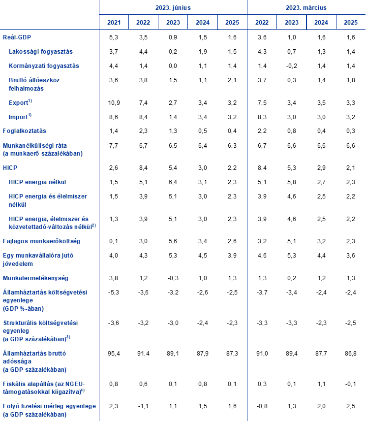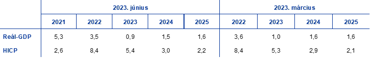 Az eurorendszer szakértőinek 2023. júniusi prognózisa szerint az euroövezet reál-GDP-je 2023 első negyedévében 0,1%-kal nő, ami 0,2 százalékponttal meghaladja az Eurostat 2023. június 8-án, a prognózisok zárónapja után közzétett becslését. Ez az eltérés nagyban összefügg azzal, hogy több kisebb, különösen volatilis negyedéves adattal rendelkező euroövezeti országra vonatkozó, gyakran jelentősebb revízióval készült prognózisok éves gyakorisággal készülnek, és az euroövezetre vonatkozó negyedéves prognózisok céljából interpoláljuk őket. Ez a megközelítés simább negyedéves profilt eredményez, mint a hivatalos Eurostat-becslésekben, amelyek az összes euroövezeti országra vonatkozó negyedéves információkon alapulnak. Ráadásul, néhány országos adat csak a 2023. júniusi prognózis adatgyűjtési zárónapja után vált elérhetővé.