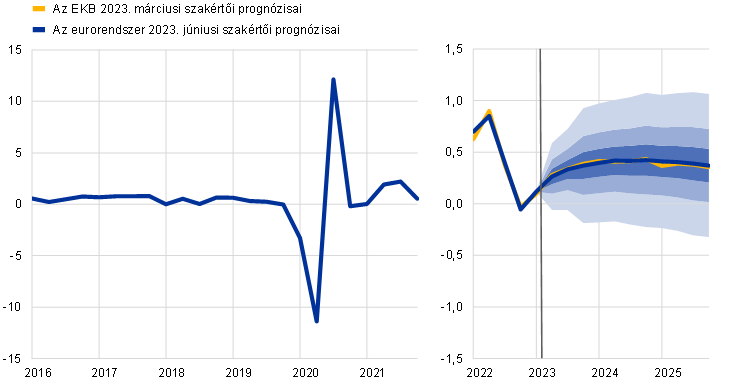 Megjegyzés: A múltbeli adatok eltérhetnek az Eurostat legutóbbi kiadványaitól (lásd a 2. lábjegyzetet). A függőleges vonal jelzi a jelenlegi előrejelzési időszak kezdetét. A prognózis alappályáját övező, szimmetrikus szerkezetű sávok a bizonytalanság mértékét mutatják. A sávok múltbeli előrejelzési hibákon alapulnak, a kiugró értékekkel való kiigazítás után. A legsötétebbtől a legvilágosabbig a reál-GDP-növekedés adott intervallumba tartozásának 30%-os, 60%-os és 90%-os valószínűségét mutatják. További információkért lásd az EKB szakértőinek az euroövezetre vonatkozó 2023. márciusi makrogazdasági prognózisában olvasható 6. keretes írást.