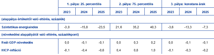 Tekintettel az energiaárak jövőbeli alakulását övező jelentős bizonytalanságra - a HICP-infláció és a reál-GDP-növekedés kilátásaira gyakorolt hatások felméréséhez - az olajárak alternatív pályáját az opciókból számított implikált olaj- és gázárakból és konstans árpályából származtatjuk. Ebben az érzékenységi elemzésben szintetikus energiaár-indexet alkalmazunk, amely ötvözi mind az olajra, mind a gázra vonatkozó futures árakat. A lefelé és felfelé irányuló alternatív pályákat a 2023. május 23-án (a technikai alapfeltevések zárónapján) érvényes olaj- és gázárakra vonatkozó opciók által implikált semleges sűrűség 25. és 75. percentilisei alapján határozzuk meg. Mindkét eloszlás a 2023. júniusi prognózisban szereplő technikai feltevések felfelé irányuló kockázatait jelzi, amelyek különösen markánsak a futures gázárak esetében. Ezen túlmenően mind az olaj-, mind a gázárak esetében konstans árfeltevést veszünk figyelembe. Az alternatív pályák hatásait az EKB és az eurorendszer prognózisaiban alkalmazott számos makrogazdasági modell alapján értékeljük. A modellek szerint a reál-GDP-növekedésére és az inflációra gyakorolt átlagos hatásokat az alábbi táblázat mutatja be.