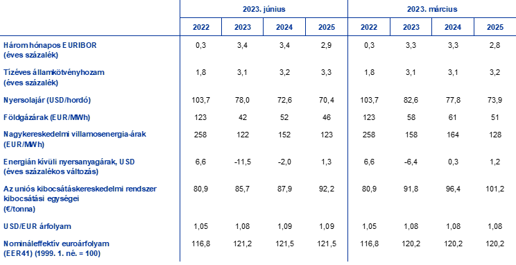 A nyersanyagárakra vonatkozó technikai feltevések a futures piac által jelzett pályán alapulnak, az adatgyűjtés 2023. május 23-i zárónapja előtti kéthetes periódus átlagát véve.