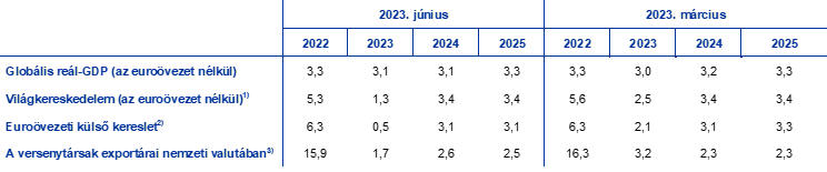A világgazdaság az évet nagyobb lendülettel kezdte, az előrejelzési időszakban várhatóan mérsékelten bővül, majd 2025-ben valamelyest felgyorsul. Az (euroövezet nélküli) globális GDP-növekedés 2023 első negyedévében a vártnál kedvezőbben alakult: mind Kínában, mind az Egyesült Államokban a vártnál nagyobb volt a növekedés, ami Kína esetében a pandémiás korlátozások feloldását követő gyorsabb és a vártnál erőteljesebb kilábaláshoz, az USA esetében pedig a rugalmas munkaerőpiachoz köthető. Az amerikai bankszektor március eleji hanyatlása a globális pénzügyi piacokon rövid ideig tartó, akut stresszhelyzetet generált. Azóta azonban – a huzamosan tartó bizonytalanság ellenére – a legtöbb eszközosztályban sikerült ledolgozni a veszteségeket. A világgazdaságban (az euroövezetet kivéve) idén és jövőre 3,1%-os növekedést prognosztizálunk. Az ütem 2025-ben várhatóan 3,3%-ra emelkedik. A 2023. márciusi prognózishoz képest a növekedési kilátások nagyjából változatlanok.