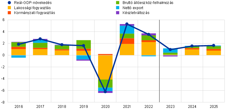 A prognózis szerint középtávon tovább erősödik a GDP-növekedés, amit a reáljövedelem további emelkedése és az erősödő külső kereslet támogat, bár a szigorúbb finanszírozási feltételek és a szigorúbb fiskális alapállás hátráltatja. A reál-GDP növekedése 2023 folyamán várhatóan erősödik, majd 2024–25-ben az előző negyedévhez képest 0,4% körüli ütemben stabilizálódik. A növekedést várhatóan a kínálati sokkok és a bizonytalansággal kapcsolatos elővigyázatossági magatartás lecsengése mellett a mérséklődő inflációs nyomás is erőteljesen támogatja, összefüggésben a foglalkoztatás és a munkajövedelmek szilárd növekedésével, ami lehetővé teszi a rendelkezésre álló reáljövedelem és a fogyasztás folyamatos élénkülését. Ugyanakkor ezen kedvező hatások lendületét mérsékli a finanszírozási feltételek szigorodása, az euro múltbeli felértékelődése és a fiskális támogatások fokozatos visszavonása.
