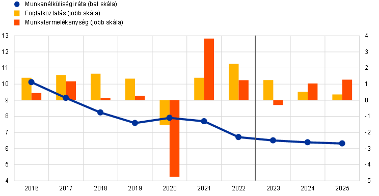 A munkaerőpiac a prognózis szerint továbbra is teherbíró és feszes marad az előrejelzési időszakban (3. ábra). A foglalkoztatás 2023 első negyedévében erőteljesen, 0,6%-kal nőtt az előző negyedévhez képest, a reál-GDP enyhe csökkenése ellenére. Ez elsősorban az erőteljes munkaerő-növekedésnek volt köszönhető. A foglalkoztatás 2023-ban várhatóan 1,3%-kal nő, de az előrejelzési időszak hátralevő részében lassul, egészen 0,4%-ig 2025-ben. Az előrejelzések szerint a munkanélküliségi ráta a már korábban is hosszú időszakot tekintve alacsony szintről 2025-re 6,3%-ra csökken. Az egy foglalkoztatottra jutó átlagos ledolgozott órák száma a prognózis szerint tovább emelkedik az előrejelzési időszakban – szemben a világjárványt megelőző években tapasztalt csökkenő tendenciával –, de a jelek szerint 2025 negyedik negyedévében is a válság előtti szint alatt marad. A termelékenységnövekedés, amely az elmúlt negyedévekben meredeken visszaesett, és 2023 első negyedévében 0,6%-kal csökkent, a prognózis szerint idén éri el a mélypontját, majd 2024-ben és 2025-ben a hosszú időszakban mért átlag fölé emelkedik.