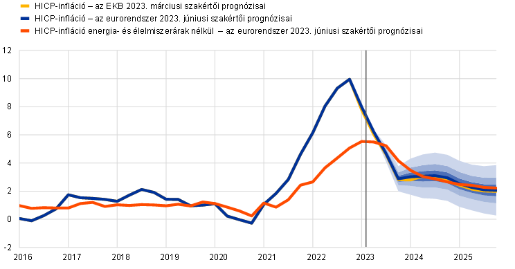 Megjegyzés: A függőleges vonal jelzi a jelenlegi előrejelzési időszak kezdetét. A HICP-inflációra vonatkozó központi prognózisok körüli sávokat a kiugró értékek miatti kiigazítás után számított múltbeli előrejelzési hibák alapján határozzuk meg. A legsötétebbtől a legvilágosabbig a HICP-inflációs eredmények adott intervallumba tartozásának 30%-os, 60%-os és 90%-os valószínűségét mutatják. További információkért lásd: Az EKB szakértőinek az euroövezetre vonatkozó 2023. márciusi makrogazdasági prognózisában olvasható 6. keretes írást.
