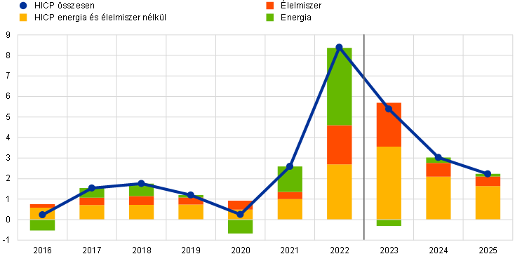 A HICP-vel mért infláció 2023-ban előreláthatólag átlagosan 5,4%-ra esik, majd 2024-ben tovább csökken 3,0%-ra, 2025-ben pedig 2,2%-ra. A 2023. évi meredek csökkenést követően az infláció 2024-ben várhatóan 3,0% körül mozog, majd 2025-ben fokozatosan tovább csökken (4. ábra). A csökkenés azt tükrözi, hogy az előrejelzési időszakban valamennyi fő inflációs komponens éves változási üteme különféle mértékben visszaesett, a pályára kihatottak a fiskális politikai intézkedések és a nyersanyagár-feltevések (5. ábra).