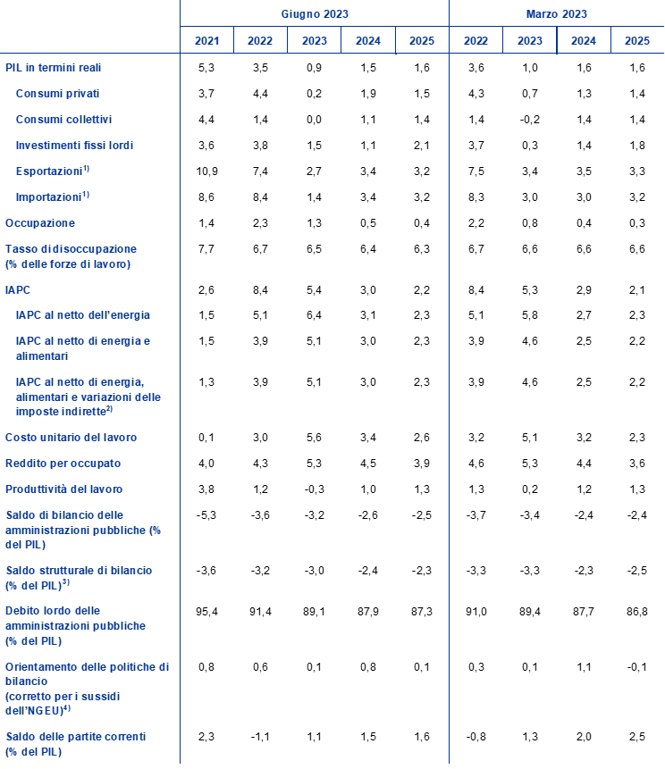 Rispetto alle proiezioni dello scorso marzo, il tasso di incremento del PIL in termini reali è stato rivisto verso il basso di 0,1 punti percentuali per il 2023 e per il 2024, ma rimane invariato per il 2025. Nel confronto con le ipotesi formulate nell’esercizio previsivo di marzo, l’impatto sulla crescita esercitato dall’inasprirsi delle condizioni di offerta del credito sarebbe lievemente più negativo nel 2023 e sostanzialmente invariato nel periodo 2024-2025. Anche le scorte dovrebbero fornire un contributo minore nel 2023 rispetto alle proiezioni di marzo. Oltre il breve termine si ritiene che il contributo più debole delle esportazioni nette, specialmente nel 2024, sia compensato dal rafforzamento della domanda interna sorretto da un’espansione più robusta del reddito disponibile reale e da una minore incertezza.