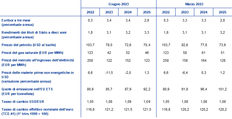 Rispetto alle proiezioni dello scorso marzo, le ipotesi tecniche includono un lieve aumento dei tassi di interesse, una diminuzione dei prezzi del petrolio, un calo considerevole dei prezzi all’ingrosso di gas ed elettricità e un apprezzamento dell’euro. Le ipotesi tecniche concernenti i tassi di interesse e i prezzi delle materie prime sono basate sulle aspettative di mercato al 23 maggio 2023. I tassi di interesse a breve termine si riferiscono all’Euribor a tre mesi e le aspettative di mercato sono desunte dai tassi dei contratti future, mentre i rendimenti dei titoli di Stato a dieci anni sono utilizzati come misura indiretta dei tassi di interesse a lungo termine[4]. I tassi sia a breve sia a lungo termine sono aumentati leggermente dopo la data di chiusura delle proiezioni di marzo e, rispetto a queste ultime, il loro profilo è stato rivisto al rialzo di circa 10 punti base sulla scia degli ulteriori aumenti dei tassi di interesse di riferimento della BCE.