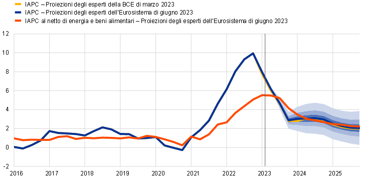 Nota: la linea verticale indica l’inizio dell’attuale orizzonte temporale di proiezione. Gli intervalli di valori delle proiezioni centrali per l’inflazione misurata sullo IAPC si basano sugli errori di proiezione passati, al netto della correzione per i valori anomali. Le bande, dalla più scura alla più chiara, descrivono una probabilità del 30%, del 60% e del 90% che il dato relativo all’inflazione misurata sullo IAPC rientri nei rispettivi intervalli. Per maggiori dettagli, cfr. il riquadro 6 delle Proiezioni macroeconomiche per l’area dell’euro formulate dagli esperti della BCE, marzo 2023.