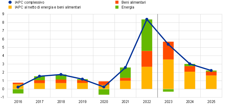 L’inflazione misurata sull’indice armonizzato dei prezzi al consumo (IAPC) si sta dimostrando più persistente del previsto, nonostante il calo dei prezzi dell’energia e l’allentamento delle strozzature dal lato dell’offerta. Con il tasso di variazione dei prezzi dei beni energetici che diventerebbe sempre più negativo nel corso del 2023 e quello degli alimentari che subirebbe una netta moderazione, l’inflazione complessiva dovrebbe continuare a diminuire collocandosi a circa il 3% nell’ultimo trimestre dell’anno. Ciò nondimeno, lo IAPC calcolato al netto dei beni energetici e alimentari dovrebbe superare quello complessivo nel breve periodo e mantenersi al di sopra di quest’ultimo fino agli inizi del 2024 pur seguendo un graduale percorso discendente a partire dalla seconda metà del 2023. In un contesto in cui gli effetti indiretti dei passati shock ai prezzi dell’energia e le altre pressioni inflazionistiche vengono gradualmente meno, determinando il calo atteso, il costo del lavoro diventerà il fattore principale alla base dell’inflazione misurata sullo IAPC al netto della componente energetica e alimentare. La crescita dei salari resterebbe pari a oltre il doppio della media storica per gran parte dell’orizzonte temporale della proiezione, grazie agli effetti della compensazione per l’inflazione e alle condizioni tese nel mercato del lavoro, oltre che agli aumenti delle retribuzioni minime. Nondimeno i margini di profitto, che si erano notevolmente ampliati nel 2022, dovrebbero assorbire in parte la trasmissione di questi costi nel medio periodo. Si prevede inoltre che la politica monetaria freni ulteriormente l’inflazione di fondo nei prossimi anni. Nell’insieme, l’inflazione complessiva scenderebbe dall’8,4% nel 2022 a una media del 5,4% nel 2023, del 3,0% nel 2024 e del 2,2% nel 2025. Rispetto alle proiezioni dello scorso marzo, lo IAPC complessivo è stato rivisto lievemente verso l’alto per l’intero periodo in esame. Ciò è dovuto principalmente alla considerevole correzione al rialzo del tasso calcolato al netto della componente energetica e alimentare, di riflesso a revisioni riconducibili ai recenti livelli di inflazione superiori alle attese e alla dinamica lievemente più sostenuta del costo del lavoro per unità di prodotto, che hanno più che compensato l’effetto delle ipotesi di prezzi dell’energia inferiori e dell’inasprirsi delle condizioni di finanziamento.