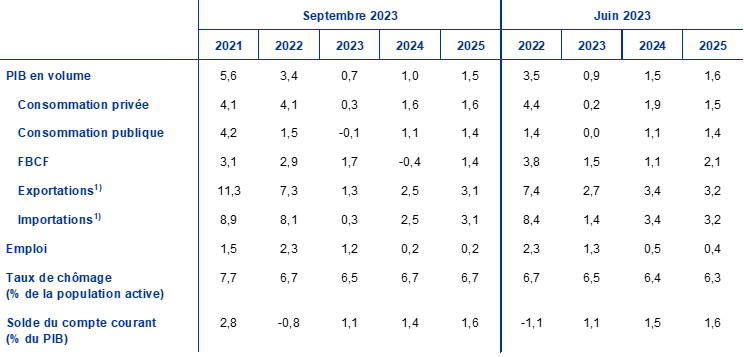Les perspectives de croissance à court terme se sont détériorées dans la zone euro tandis que, à moyen terme, l’économie devrait graduellement retrouver une croissance modeste sous l’effet du redressement de la demande tant intérieure qu’extérieure. L’activité économique dans la zone euro a progressé de façon modérée au premier semestre 2023 malgré le niveau considérable des carnets de commandes dans le secteur manufacturier et le relâchement des prix élevés de l’énergie. En outre, ces effets se sont largement atténués et les indicateurs à court terme font état d’une stagnation à court terme face au durcissement des conditions de financement, à la faiblesse de la confiance des chefs d’entreprise et des consommateurs et à une demande extérieure atone dans un contexte de renforcement de l’euro. La croissance devrait se redresser à partir de 2024, la demande extérieure se rapprochant de sa tendance d’avant la pandémie et les revenus réels s’améliorant, à la faveur du recul de l’inflation, d’une progression soutenue des salaires nominaux et d’un chômage toujours faible, quoique en légère hausse. Toutefois, la croissance continuerait d’être freinée à mesure que le resserrement de la politique monétaire de la BCE et les conditions défavorables de l’offre de crédit se répercuteront sur l’économie réelle et que les mesures de soutien budgétaire seront progressivement retirées. Dans l’ensemble, la croissance annuelle moyenne du PIB en volume devrait ralentir, de 3,4 % en 2022 à 0,7 % en 2023, avant de se redresser pour atteindre 1,0 % en 2024 et 1,5 % en 2025. Par rapport aux projections de juin 2023 établies par les services de l’Eurosystème, les perspectives de croissance du PIB ont été révisées à la baisse de 0,2 point de pourcentage pour 2023, 0,5 point de pourcentage pour 2024 et 0,1 point de pourcentage pour 2025, reflétant une dégradation significative des perspectives à court terme, dans un contexte de détérioration des indicateurs tirés d’enquêtes, de durcissement des conditions de financement – y compris des effets plus néfastes sur l’offre de crédit – et d’une appréciation du taux de change de l’euro[1].
