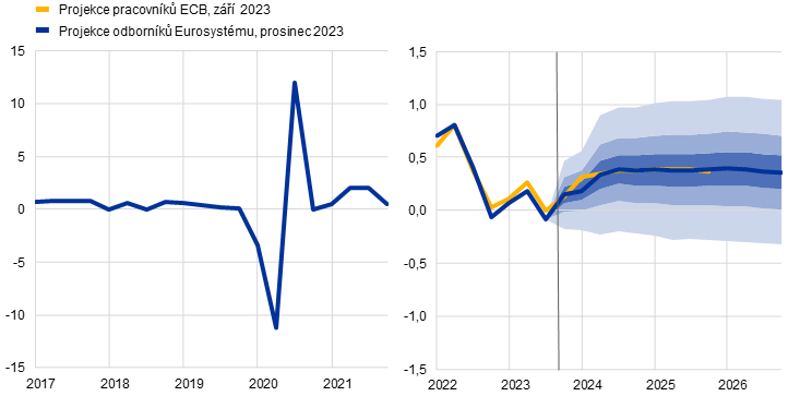 Poznámky: Údaje za minulá období se mohou lišit od nejnovějších publikací Eurostatu (viz také poznámka pod čarou 2). Svislá čára označuje začátek stávajícího horizontu projekcí. Rozpětí v okolí středových projekcí slouží jako ukazatel míry nejistoty a jsou ze své podstaty symetrická. Vycházejí z chyb v minulých projekcích po očištění o mimořádné hodnoty. Pásma od nejtmavšího po nejsvětlejší zobrazují 30%, 60% a 90% pravděpodobnost, že výsledek růstu reálného HDP bude spadat do příslušných intervalů. Více informací je k dispozici v boxu 6 makroekonomických projekcí pro eurozónu z března 2023 sestavených pracovníky ECB.