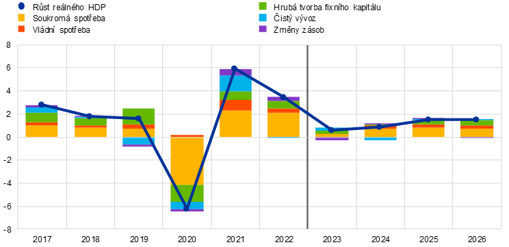 Poznámky: Údaje o reálném HDP jsou roční průměry očištěné o sezonní vlivy a vliv počtu pracovních dní. Údaje za minulá období se mohou lišit od nejnovějších publikací Eurostatu z důvodu zveřejnění údajů po datu jejich uzávěrky pro projekce. Údaje (i čtvrtletní) jsou k dispozici ke stažení v databázi makroekonomických projekcí na internetových stránkách ECB.