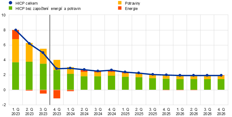 Inflace se nadále snižovala v důsledku klesajícího tempa růstu cen energií, dopadu zpřísnění měnové politiky a pokračujícího zmírňování tlaků v dodavatelských řetězcích a překážek v dodávkách. Po poklesu na 2,4 % v listopadu 2023 se očekává, že inflace měřená HICP v krátkodobém horizontu dočasně oživí v důsledku zotavení růstu cen energií. Základní dezinflační proces by však měl pokračovat i přes výrazný růst nákladů práce, které jsou stále více dominantním faktorem inflace měřené HICP bez započtení energií a potravin. I přes určité ochlazení se předpokládá, že trh práce zůstane napjatý, což by spolu s kompenzačními vlivy dřívější vysoké inflace mělo udržet růst nominálních mezd na vysoké úrovni. Růst mezd by se však měl v horizontu projekcí zmírňovat s tím, jak budou postupně odeznívat růstové dopady inflační kompenzace. Zisky v roce 2022 výrazně vzrostly, ale v horizontu projekcí by měly oslabit a poskytnout rezervu pro promítání nákladů práce. Vzhledem k hodnocení, že střednědobá inflační očekávání zůstanou ukotvena na úrovni 2% inflačního cíle ECB, by se celková inflace měřená HICP měla snížit z průměrné hodnoty 5,4 % v roce 2023 na 2,7 % v roce 2024, 2,1 % v roce 2025 a 1,9 % v roce 2026. V porovnání s projekcemi ze září 2023 byla inflace měřená HICP pro roky 2023 a 2024 revidována směrem dolů, a to především v důsledku nižších než očekávaných nedávno zveřejněných údajů a nižších předpokladů pro ceny energetických komodit, zatímco pro rok 2025 zůstává beze změny.
