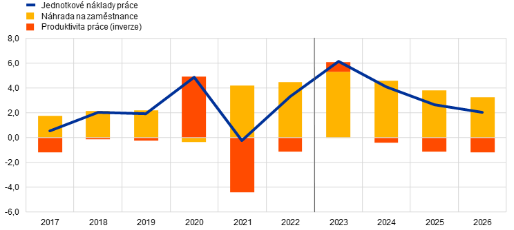 I když se očekává, že růst nominálních mezd zůstane silný a bude podporován stále napjatou situací na trzích práce, měl by časem postupně klesat s tím, jak budou odeznívat tlaky spojené s inflačními kompenzacemi a růstem minimálních mezd. Tempo růstu náhrady na zaměstnance by mělo v roce 2026 klesnout na 3,3 % oproti 5,3 % v roce 2023. V porovnání se zářijovými projekcemi bylo tempo růstu pro rok 2024 revidováno směrem nahoru, pro rok 2025 však zůstalo beze změny. Revize pro rok 2024 směrem nahoru odráží napjatější situaci na trhu práce a očekávaný silnější růst sjednaných mezd v blízké budoucnosti. Silnější růst mezd také implikuje, že ztráty kupní síly vzniklé od prudkého nárůstu inflace by se měly do konce roku 2024 zotavit, což je o něco dříve, než se očekávalo v zářijových projekcích. Očekává se, že růst jednotkových nákladů práce dosáhl vrcholu a podle projekcí bude výrazně klesat, a to částečně díky předpokládanému zrychlení růstu produktivity (graf 8), který by však měl zůstat pod úrovní, kterou naznačuje historický trend.
