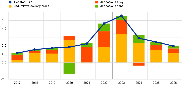 Více informací o rozložení deflátoru HDP a úloze jednotkových zisků pro analýzu inflace viz box E. Hahna s názvem „How have unit profits contributed to the recent strengthening of euro area domestic price pressures?“, Ekonomický bulletin, č. 4, ECB, 2023; dále také: Arce, O., Hahn, E. a Koester, G., „How tit-for-tat inflation can make everyone poorer“, Blog ECB, 30. března 2023.