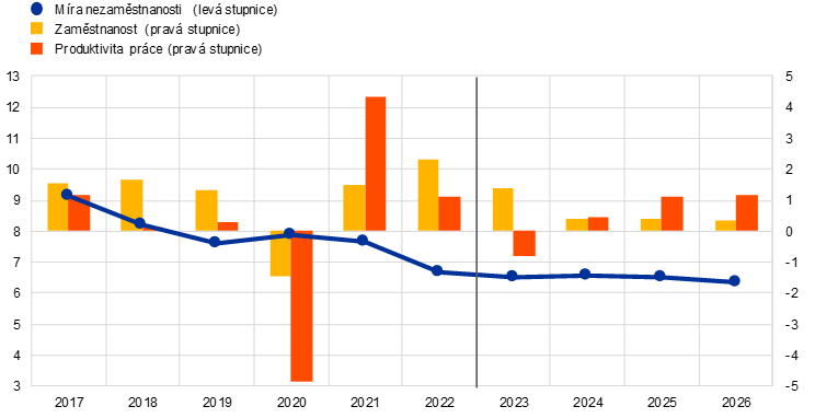 Očekává se, že trh práce zůstane odolný i přes určité uvolnění podmínek na trhu práce a mírnější růst zaměstnanosti (v porovnání s HDP) než v roce 2023. Očekává se, že růst celkové zaměstnanosti zpomalí, zůstane však v kladných číslech – sníží se z 2,3 % v roce 2022 na 1,4 % v roce 2023 a poté se v období 2024–2026 stabilizuje na 0,4 % (graf 3). Ve srovnání s projekcemi ze září 2023 byl růst zaměstnanosti v celém horizontu projekcí (v kumulativním vyjádření) revidován o 0,6 procentního bodu směrem nahoru, což implikuje revizi růstu produktivity práce směrem dolů. Tento vývoj odráží předpoklad hromadění pracovních sil ve stávajícím prostředí slabého hospodářského růstu, které odezní v pozdějších letech horizontu projekcí, kdy ekonomika opět posílí. Celkově se očekává, že růst produktivity práce v horizontu projekcí posílí, ale úroveň produktivity zůstane výrazně pod dlouhodobým lineárním trendem. Očekává se, že míra nezaměstnanosti v krátkodobém horizontu mírně vzroste na 6,6 % v roce 2024 a poté ve zbývající části horizontu projekcí klesne v průměru na 6,5 % v roce 2025 a 6,4 % v roce 2026. I když je to v rozporu s mírným růstem předpokládaným v projekcích ze září 2023, obecné hodnocení napjaté situace na trhu práce zůstává platné.