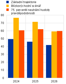 Míra úspor domácností by měla během horizontu projekcí zůstávat na zvýšené úrovni ve srovnání s obdobím před pandemií. Míra úspor se v první polovině roku 2023 zvýšila a očekává se, že po určitou dobu zůstane vysoká a bude tak odrážet výrazný růst nepracovních příjmů v první polovině roku (částečně v důsledku vysokého sklonu k úsporám tohoto typu příjmů), stále zvýšenou nejistotu a silné investiční pobídky vyplývající z rostoucích úrokových sazeb. S tím, jak ustupuje nejistota, by však měla od roku 2025 míra úspor domácností mírně klesat, i když zůstane výrazně nad svou úrovní před pandemií, neboť vyšší úrokové sazby vyvažují snahu domácností své chování ve vztahu k úsporám vrátit po pandemii k normálu. Neočekává se, že růstu spotřeby poskytne podporu objem nadměrných úspor, neboť je koncentrován v bohatých domácnostech, většinou akumulován v nelikvidních aktivech, přičemž vysoká míra inflace měla tlumící vliv na jeho reálnou hodnotu. Míra úspor byla v porovnání s projekcemi ze září 2023 revidována směrem nahoru a odráží především revize historických údajů, očekávané obezřetnější chování domácností a silnější pobídky k úsporám v důsledku vysokých úrokových sazeb a náročnějšího přístupu k úvěrům.