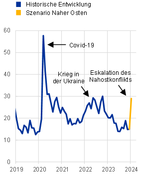 Im Eskalationsszenario dürfte sich auch die Unsicherheit erhöhen, mit der die wirtschaftlichen Aussichten behaftet sind. Dies würde zu einem Rückgang des privaten Konsums, der Investitionstätigkeit und des Handels sowie zu einer erheblichen Neubewertung von Finanzmarktinstrumenten führen. Im vorliegenden Szenario wird davon ausgegangen, dass der Volatilitätsindex VIX, ein Näherungswert für die globale Unsicherheit, Anfang 2024 um rund 14 Punkte in die Höhe getrieben würde (siehe Abbildung A, Grafik b). Dies entspricht von der Größenordnung her in etwa der Entwicklung nach Ausbruch des Ukraine-Kriegs und zum Zeitpunkt vergangener geopolitischer Ereignisse im Nahen Osten. Danach dürfte den historischen Regelmäßigkeiten entsprechend allmählich wieder das Niveau vor dem Konflikt erreicht werden. Die hohe Finanzmarktvolatilität würde mit einer drastischen Verschlechterung des Unternehmens-, Verbraucher- und Finanzmarktvertrauens einhergehen.