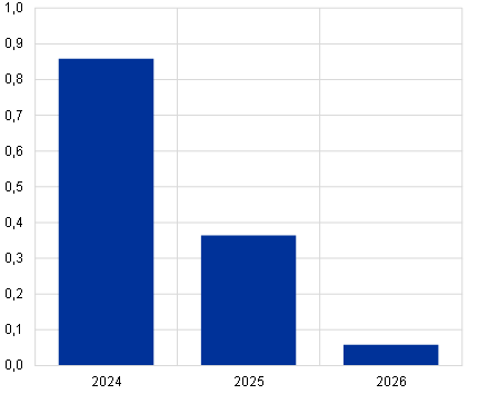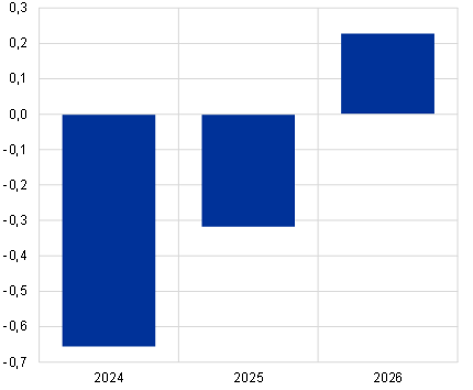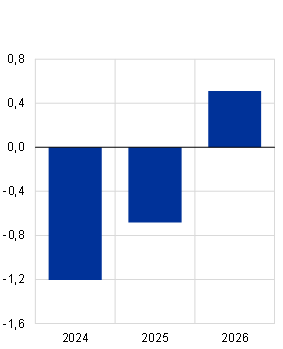 Im Euroraum würde sich das Wirtschaftswachstum aufgrund höherer Energiepreise, Unsicherheitseffekte und internationaler Ansteckungseffekte abschwächen. Gleichzeitig würde die Verbraucherpreisinflation vor allem aufgrund höherer Energiepreise anziehen (siehe Abbildung B). Auch im Euroraum würde die Wirtschaftstätigkeit wie in der übrigen Welt durch die höheren Öl- und Gaspreise sowie die erhöhte Unsicherheit direkt beeinträchtigt. Private Haushalte und Unternehmen würden ihre realen Konsumausgaben und Investitionen infolge des Schocks einschränken. Darüber hinaus schlügen sich internationale Ansteckungseffekte negativ in der Auslandsnachfrage nach Exporten des Euroraums nieder, wodurch sich die gesamtwirtschaftliche Nachfrage weiter reduzieren würde. Insgesamt wird das Wachstum des realen BIP im Euroraum den Schätzungen zufolge 2024 um 0,7 Prozentpunkte und 2025 um 0,3 Prozentpunkte niedriger ausfallen als in den Basisprojektionen vom Dezember 2023. Den Schätzungen zufolge wird es 2026 wieder anziehen, da die Unsicherheitseffekte bis dahin allmählich nachlassen dürften. Die HVPI-Inflation im Euroraum würde 2024 um 0,9 Prozentpunkte und 2025 um 0,4 Prozentpunkte steigen, was in erster Linie den weltweit höheren Energiepreisen geschuldet wäre.