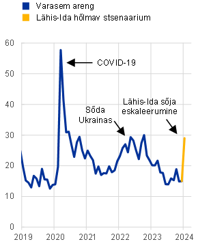 Selles stsenaariumianalüüsis uuritakse 2023. aasta detsembri ettevaate põhistsenaariumit ohustavaid erakordseid riske, mis tulenevad Lähis-Ida konflikti võimalikust edasisest eskaleerumisest. 2023. aasta detsembri põhiprognoosis eeldatakse, et praegune konflikt jääb geograafiliselt piiratuks ja seetõttu ei avalda see euroala majandusele eeldatavasti märkimisväärset majanduslikku mõju lisaks sellele, mida on juba täheldatud. Üleilmsete finantsturgude reaktsioon konflikti puhkemisele on olnud vaoshoitud, väljendudes esialgu naftahinna ja majandusliku ebakindluse tagasihoidlikus kasvus. See on kooskõlas euroala piiratud kaubandus- ja finantssidemetega konfliktist mõjutatud piirkondadega. Siinses infokastis esitatud stsenaariumis eeldatakse konflikti ulatuslikku ja pikaajalist süvenemist ning Hormuzi väina osalist sulgemist, millel oleks maailmamajandusele ja euroalale raskemad tagajärjed, kui on eeldatud 2023. aasta detsembri põhiprognoosis. See tooks kaasa häired majandustegevuses eelkõige konflikti otseselt kaasatud riikides, aga ka kõrgemad energiatoormehinnad ning laiema majandusliku ebakindluse ja finantsturu häirete kasvu (vt joonis A). Sellist stsenaariumit peetakse erakordse riski stsenaariumiks ja arvestades konflikti arenguga seotud suurt ebakindlust, tuleks hinnangutesse suhtuda suure ettevaatusega.