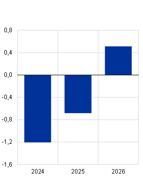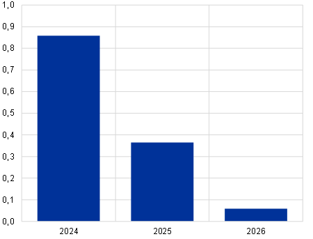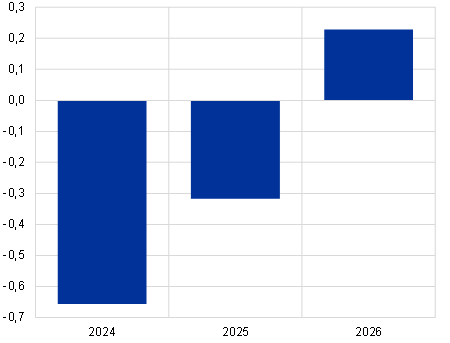 Energiahindade inflatsioon peaks ajutiselt jõuliselt kiirenema, kuid aeglustub 2024. aasta teisel poolel taas ning jõuab 2025. ja 2026. aastal nulli lähedale. Energiahindade aastase inflatsioonimäära tõus lähiajal kajastab 2023. aasta detsembris peamiselt positiivset baasefekti (vt joonis 5) ja 2024. aastal energiahindade inflatsiooniga seotud kompenseerivate eelarvemeetmete lõppemist (millel on eriti tugev mõju gaasi- ja elektrihindadele). Nende meetmete muutmine alates 2023. aasta detsembrist kiirendab hinnanguliselt ÜTHI-koguinflatsiooni 2024. aastal ligikaudu 0,4 protsendipunkti võrra. Baasefektidest ja valitsuse meetmete lõppemisest tulenev tõusumõju kaalub tõenäoliselt täielikult üles energiatoorme (nafta, gaas ja elekter) hindade ning CO2 heite hindade hiljutise languse. Tõusumõju taandudes põhjustab eeskätt energiatoorme futuurihindade kerge langustrend eelduste kohaselt ÜTHI energiahindade inflatsiooni mõningase aeglustumise ettevaateperioodi lõpus.