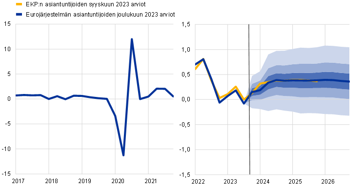 Huom. Aiempien vuosien tiedot voivat poiketa Eurostatin julkaisemista tiedoista (ks. myös alaviite 2). Arviointijakson alku on merkitty pystyviivalla. Symmetriset vaihteluvälit keskeisten asiantuntija-arvioiden ympärillä kuvastavat mahdollisten poikkeamien todennäköisyyttä. Ne perustuvat aiempiin arviointivirheisiin, puhdistettuina äärihavainnoista. Vaihteluvälit kuvaavat arvioidusta poikkeavan kehityksen hajontaa (tummemmasta vaaleampaan 30, 60 ja 90 prosentin todennäköisyys). Lisätietoa on EKP:n asiantuntijoiden maaliskuisten arvioiden kehikossa 6.