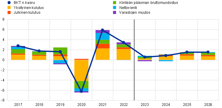 Keskipitkällä aikavälillä BKT:n kasvun odotetaan vakaantuvan kutakuinkin pandemiaa edeltäneelle keskimääräiselle tasolle. Tätä kehitystä tukevat reaalitulojen kasvu ja euroalueen ulkoisen kysynnän vahvistuminen. BKT:n kasvun odotetaan vahvistuvan vuosina 2024 ja 2025 ja vakaantuvan sitten vuonna 2026 (ks. taulukko 2). Viimeaikaisten suotuisten tekijöiden vaikutus on väistymässä, mutta inflaatiopaineiden laskun arvioidaan pitävän kasvua yllä energiasokin hiipumisen ja tulojen vahvan kasvun tuella. Näiden tekijöiden ansiosta yksityinen kulutus elpyy voimakkaasti, kun työmarkkinatkin pysyvät vahvana. Asteittainen luopuminen vuonna 2022 käyttöön otetuista energian hintaa ja inflaatiota kompensoivista finanssipoliittisista tukitoimista aiheuttaa kuitenkin pienen kasvua hidastavan vaikutuksen vuosille 2024–2026.