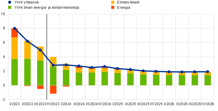Inflaatio on jatkanut hidastumistaan, kun energiahinnat ovat laskeneet, rahapolitiikka on kiristynyt ja tuotantoketjun inflaatiopaineet ja tarjontakapeikot ovat hellittäneet. YKHI-inflaatio hidastui 2,4 prosenttiin marraskuussa 2023, mutta sen odotetaan nopeutuvan tilapäisesti lyhyellä aikavälillä energiahintainflaation nopeutuessa. Inflaation hidastumisen odotetaan kuitenkin jatkuvan taustalla työvoimakustannusten voimakkaasta noususta huolimatta. Työvoimakustannukset ovat yhä selvemmin tärkein energian ja elintarvikkeiden hinnoista puhdistettua YKHI-inflaatiota nopeuttava tekijä. Työmarkkinoiden arvioidaan pysyvän kireinä, vaikka ne ovatkin hieman rauhoittumassa. Kireät työmarkkinat ja aiemman nopean inflaation aiheuttamat kompensaatiovaikutukset pitävät todennäköisesti nimellispalkkojen kasvun voimakkaana. Palkkojen kasvun odotetaan kuitenkin laantuvan arviointijaksolla, kun sitä voimistava inflaatiokompensaatio vähitellen hiipuu. Voitot kasvoivat huomattavasti vuonna 2022, mutta niiden kehityksen odotetaan heikkenevän arviointijaksolla ja hillitsevän työvoimakustannusten välittymistä hintoihin. Keskipitkän aikavälin inflaatio-odotusten arvioidaan pysyvän EKP:n kahden prosentin inflaatiotavoitteen mukaisina. YKHI-indeksillä mitatun kokonaisinflaation odotetaankin hidastuvan 5,4 prosentista vuonna 2023 siten, että se on keskimäärin 2,7 % vuonna 2024 ja 2,1 % vuonna 2025 sekä 1,9 % vuonna 2026. YKHI-inflaatio on vuosina 2023 ja 2024 arvioitu nyt alemmaksi kuin syyskuun 2023 asiantuntija-arvioissa lähinnä siksi, että tuoreiden tietojen mukaan inflaatio on ollut odotettua hitaampaa ja energiaraaka-aineiden hinta-arviota on alennettu. Vuotta 2025 koskeva inflaatioarvio on sen sijaan ennallaan.