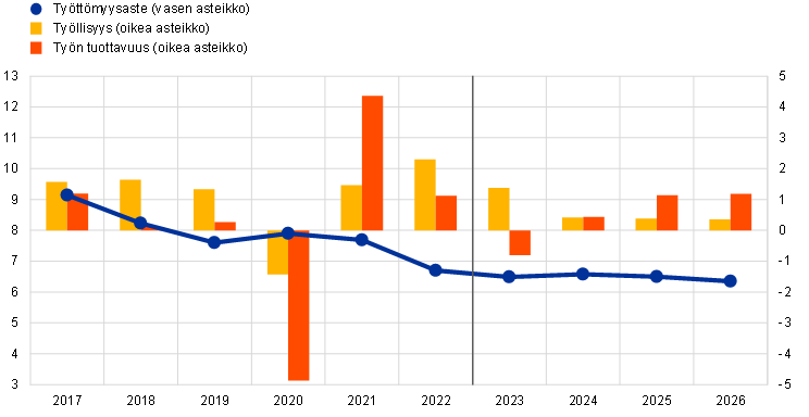 Työmarkkinoiden odotetaan pysyvän vahvoina, vaikka niiden kehitys heikkeneekin jonkin verran, kun työllisyys kasvaa (suhteessa BKT:hen) tätä vuotta maltillisemmin. Kokonaistyöllisyyden kasvun odotetaan hidastuvan mutta pysyvän silti positiivisena. Se hidastuu 1,4 prosenttiin vuonna 2023 (2,3 % vuonna 2022) ja vakaantuu sitten 0,4 prosenttiin vuosina 2024–2026 (ks. kuvio 3). Työllisyyden kasvuarvio on nyt koko arviointijaksolla (kumulatiivisesti) 0,6 prosenttiyksikköä korkeampi kuin syyskuun 2023 asiantuntija-arvioissa, mikä viittaa työvoiman tuottavuuden kasvua koskevan arvion alentamiseen. Taustalla on oletus työvoiman jonkinasteisesta ylimitoituksesta heikon talouskasvun leimaamassa nykytilanteessa, mutta ylimitoitus vähenee arviointijakson myöhempinä vuosina, kun talous jälleen vahvistuu. Työn tuottavuuden kasvun odotetaan vahvistuvan arviointijaksolla, mutta tuottavuuden taso jää silti huomattavasti pitkän aikavälin trendikehitystä heikommaksi. Työttömyysasteen odotetaan nousevan hieman lyhyellä aikavälillä siten, että se on 6,6 % vuonna 2024. Sen jälkeen työttömyysaste laskee arviointijakson loppuun niin, että se on 6,5 % vuonna 2025 ja 6,4 % vuonna 2026. Vaikka tämä onkin ristiriidassa syyskuun 2023 asiantuntija-arvioissa esitetyn työttömyysasteen hienoisen nousun kanssa, yleinen arvio kireistä työmarkkinoista pitää edelleen paikkansa.