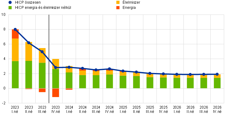 Az élelmiszerárak inflációja a prognózis szerint meredeken zuhan 2024 folyamán az árazási láncon átgyűrűző ároldali nyomás enyhülése miatt, ezt követően viszont fokozatosabban csökken. A várakozások szerint folytatódik az élelmiszerár-infláció utóbbi időben tapasztalható jelentős csökkenése, az ütem a 2023. novemberi 6,9%-os, még mindig magas szintről 2024 utolsó negyedévére 2,6%-ra esik. Ennek oka, hogy az élelmiszer- és energiaárak csökkenése miatt nagymértékben enyhült az árazási láncon kialakuló nyomás. Az élelmiszerárak inflációja ezt követően 2026-ban várhatóan fokozatosan 2,3%-ra lassul – amely még mindig meghaladja valamelyest a Covid19-világjárvány előtti 2,1%-os hosszú távú átlagos rátát –, mivel a továbbra is magas munkaerőköltség-oldali nyomás megakadályozza a gyorsabb ütemű enyhülést.