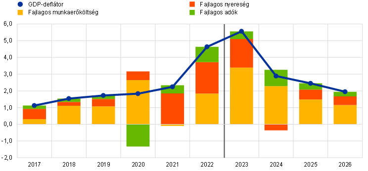 A GDP-deflátor bontásával és a fajlagos nyereségek inflációs elemzésben betöltött szerepével kapcsolatos további információkért lásd E. Hahn „How have unit profits contributed to the recent strengthening of euro area domestic price pressures?” (Hogyan járultak hozzá a fajlagos nyereségek az euroövezetben a belföldi ároldali nyomás közelmúltbeli megerősödéséhez?) című keretes írását, Gazdasági jelentés, 4. sz., EKB, 2023; valamint Arce, O., Hahn, E. és Koester, G., „How tit-for-tat inflation can make everyone poorer” (Hogyan szegényíthet el a „fogat fogért” infláció mindenkit?), Az EKB blogja, 2023. március 30.