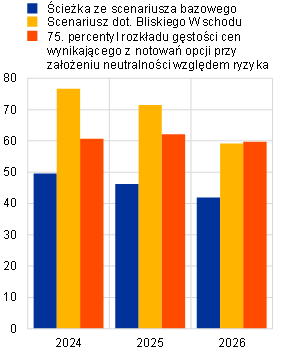 W razie hipotetycznej eskalacji konfliktu ceny ropy i gazu mogłyby znacznie wzrosnąć, szczególnie w przypadku częściowej blokady cieśniny Ormuz. W scenariuszu założono, że zakłócenia obejmą około jednej trzeciej dostaw ropy i gazu przesyłanych cieśniną Ormuz, co przyczyniłoby się do zacieśnienia warunków na światowych rynkach energetycznych. Wskutek tego w drugim kwartale 2024 ceny ropy wzrosłyby niemal do 130 USD/b, zaś ceny gazu – do 83 EUR/MWh (czyli przekroczyłyby poziomy przyjęte w scenariuszu bazowym projekcji odpowiednio o 57% i 74%). W ujęciu łącznym założono, że syntetyczny indeks cen energii (obejmujący ceny ropy i gazu) w drugim kwartale 2024 będzie o 64% wyższy od poziomu ze scenariusza bazowego, a w 2026 pozostanie od tego poziomu wyższy o 36% (wykres A, część a). To skrajny scenariusz, który spowodowałby wzrost cen energii powyżej 75. percentyla rozkładu cen terminowych energii wynikającego z notowań opcji (zob. też ramka 4). Cieśnina Ormuz nigdy nie została faktycznie zablokowana, a zakładany szok podażowy związany z ropą i gazem utrzymuje się dłużej niż dotychczas obserwowane szoki podażowe, gdyż rynki energetyczne zwykle szybciej odzyskują równowagę.