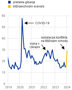 Po scenariju eskalacije konflikta bi gospodarski obeti verjetno postali bolj negotovi, kar bi povzročilo upad zasebne potrošnje, naložb in trgovinske menjave ter privedlo do precejšnjega prevrednotenja instrumentov na finančnih trgih. Scenarij eskalacije konflikta predpostavlja, da bi se indeks volatilnosti VIX, tj. približek za svetovno negotovost, v začetku leta 2024 povečal za okrog 14 točk (graf A, slika b), kar je podobno kot po začetku ukrajinske vojne in med preteklimi geopolitičnimi trenji na Bližnjem vzhodu. Zatem naj bi se postopoma vrnil na ravni pred konfliktom, kar je v skladu s preteklimi vzorci. Velika volatilnost na finančnih trgih bi bila povezana s strmim poslabšanjem zaupanja podjetij, potrošnikov in finančnih trgov.