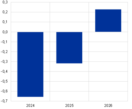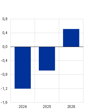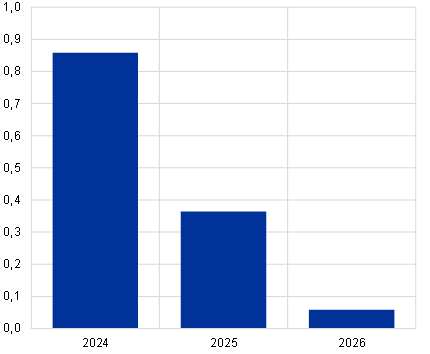 V srednjeročnem obdobju se bo rast BDP po projekcijah stabilizirala na ravni, večinoma skladni s povprečjem pred pandemijo, k čemur bosta prispevala rast realnega dohodka in krepitev zunanjega povpraševanja. Realna rast BDP se bo v obdobju 2024–2025 predvidoma okrepila in se leta 2026 stabilizirala (tabela 2). Medtem ko nedavni ugodni dejavniki popuščajo, bosta rast po projekcijah podpirala umirjanje inflacijskih pritiskov – h kateremu prispeva popuščanje energetskega šoka – pa tudi močna rast dohodka. Ti dejavniki ob odpornih trgih dela omogočajo močno okrevanje zasebne potrošnje. Vseeno pa bo imelo v obdobju 2024–2026 majhen negativen vpliv na rast umikanje ukrepov javnofinančne podpore, uvedenih od leta 2022, s katerimi se kompenzirajo cene energije in inflacija.