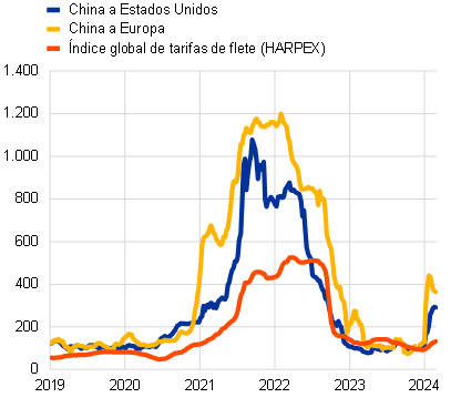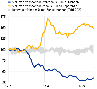 18. El impacto sobre la inflación podría ser algo más acusado si las disrupciones en el mar Rojo fueran más intensas y prolongadas. Para más detalles sobre este escenario, véase el recuadro 3.