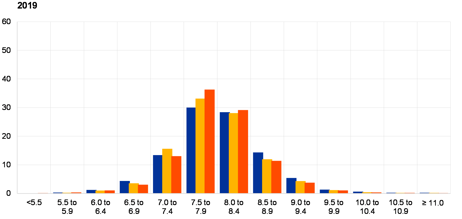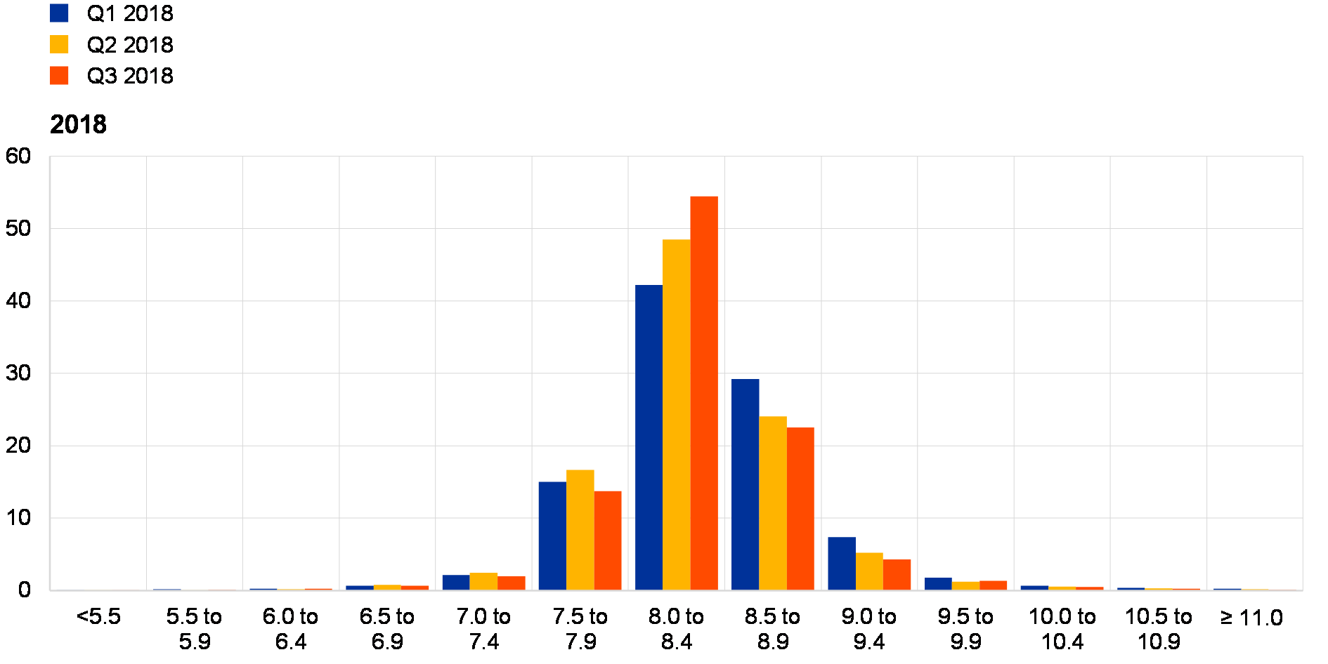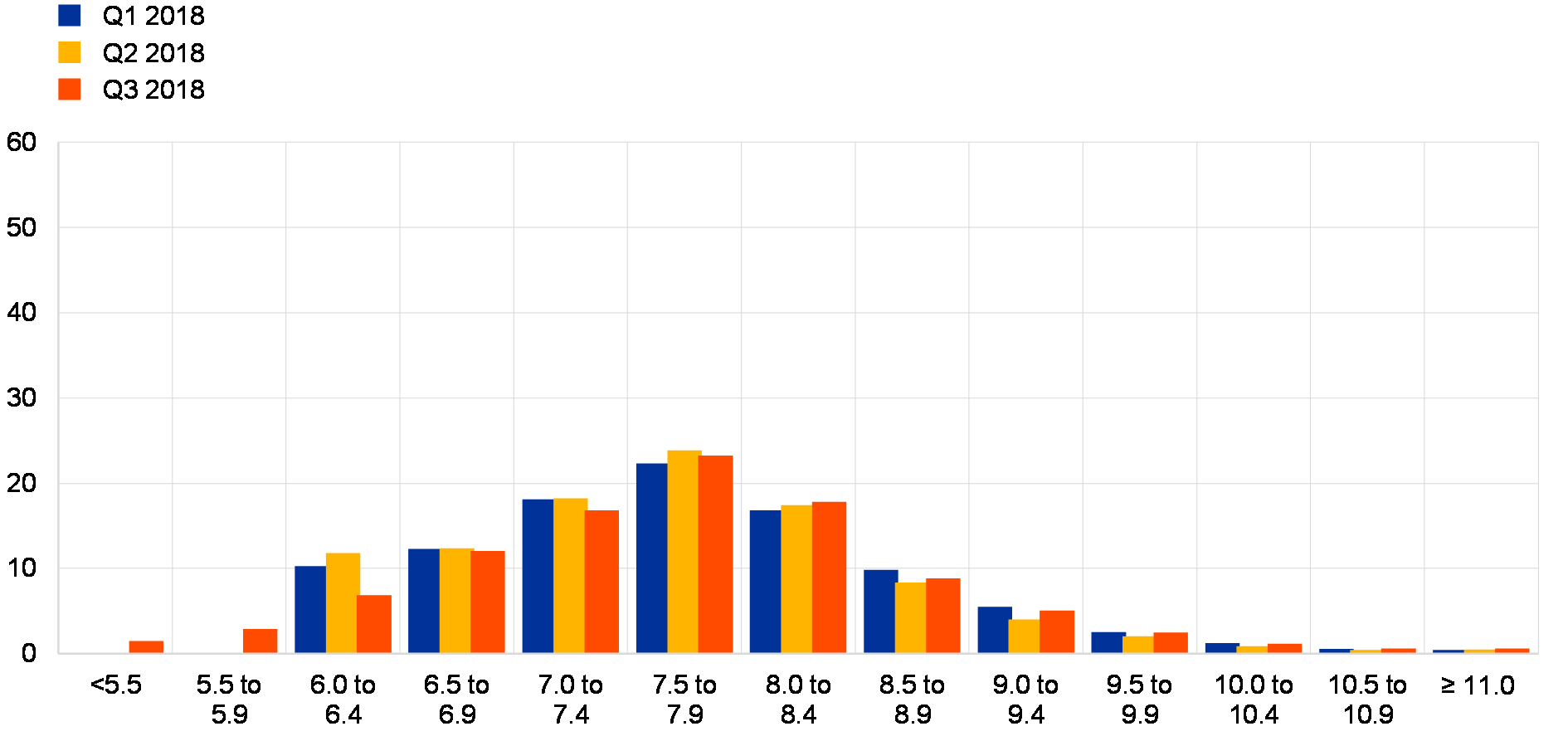 The mean expectation for the rate on the ECB’s main refinancing operations was for it to remain around 0% in the near term, increasing a little to 0.14% in 2019 and then to 0.53% in 2020 (see panel (a) of Chart 10). The aggregate expectation for the near-term, quarterly profile was unchanged from the previous survey round, whereas the expected policy rate for both 2019 and 2020 was revised down.