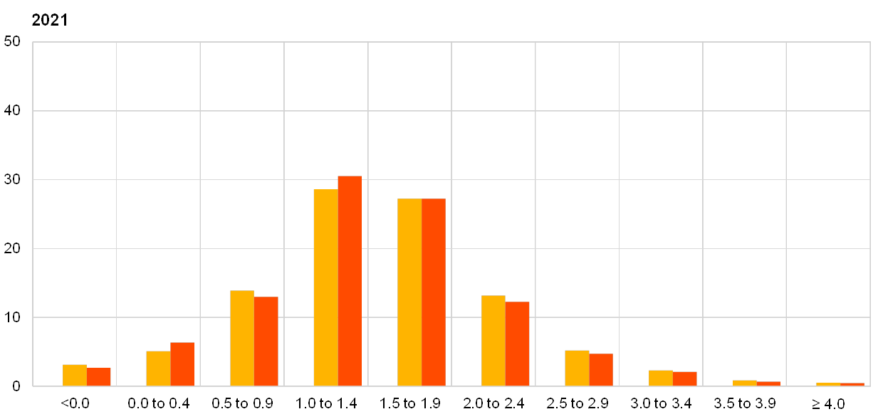 Average expectations for inflation excluding energy, food, alcohol and tobacco (HICPX) stood at 1.2%, 1.4% and 1.6% for 2019, 2020 and 2021, respectively. This represents downward revisions of 0.1 p.p. for both 2019 and 2020, but no change for 2021. However, when calculated using the unrounded results, the downward revisions are of a similar magnitude for all three years (see Chart 1).