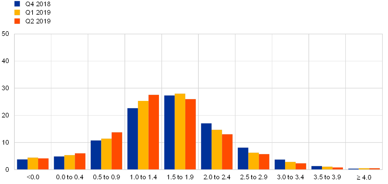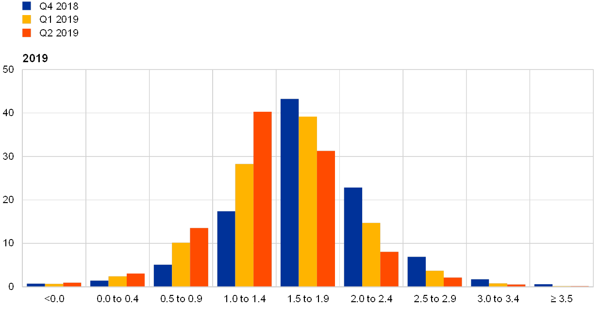 The mean expectation for the rate on the ECB’s main refinancing operations was for it to remain around 0% in the near term, increasing a little to 0.13% in 2020 and then to 0.37% in 2021 (see panel (a) of Chart 12). Both the aggregate expectation for the near-term, quarterly profile and the expected policy rate in 2020 and 2021 were revised down from the previous round.