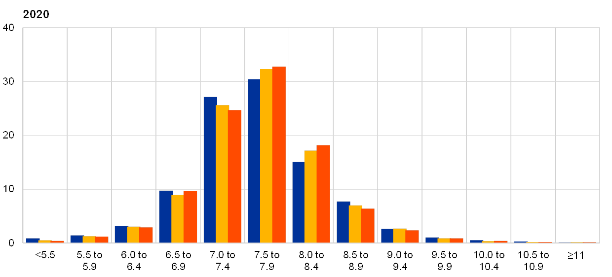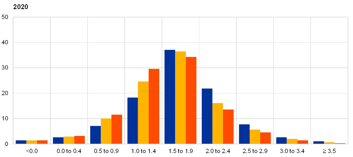 (x-axis: HICP longer-term inflation expectations, annual percentage changes; y-axis: percentages of respondents)
