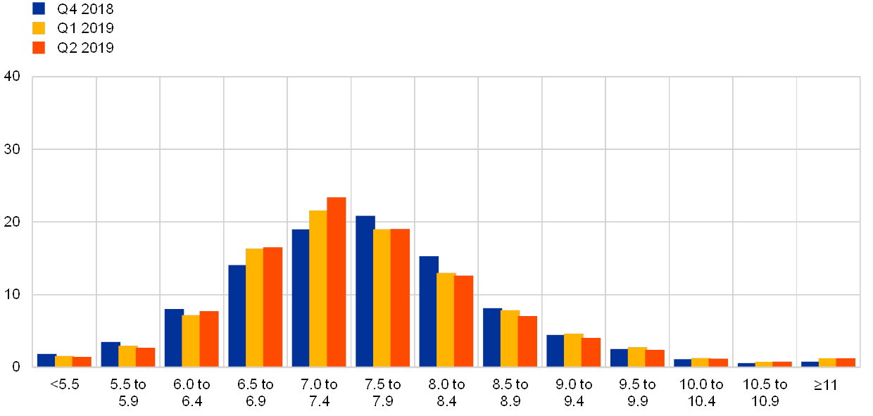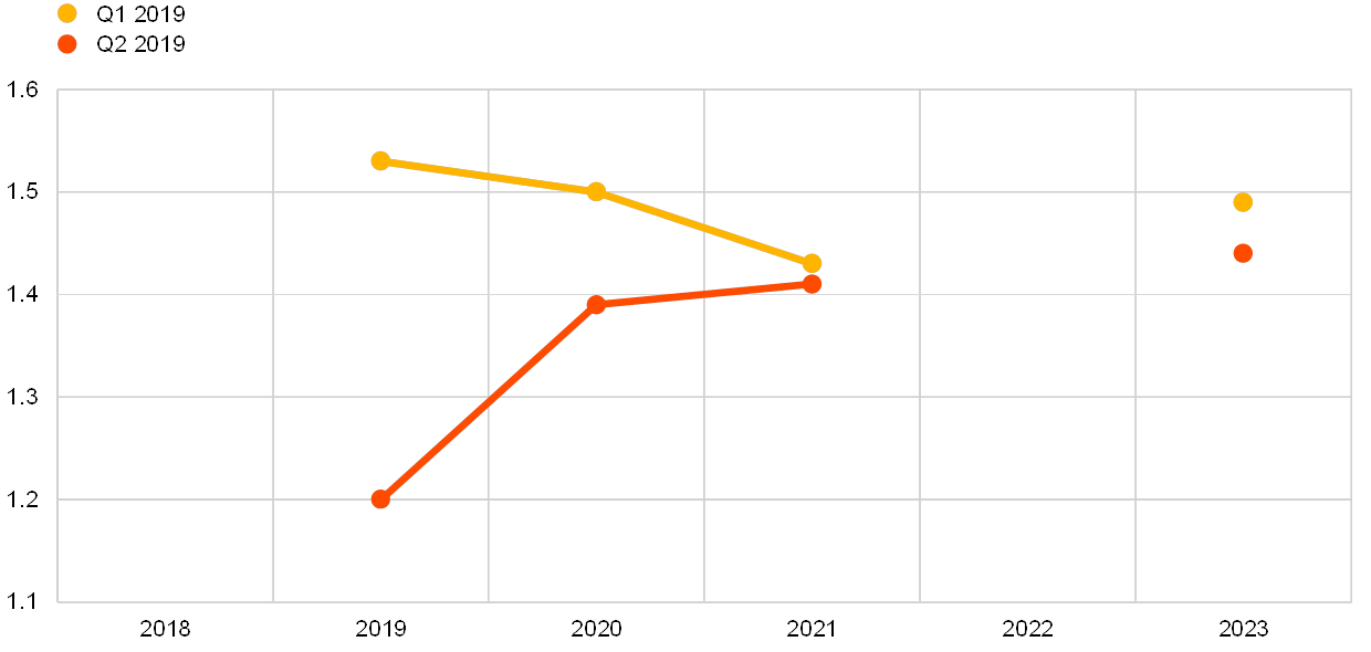 The results of the ECB Survey of Professional Forecasters (SPF) for the second quarter of 2019 show further downward revisions to inflation and real GDP growth expectations.[1] HICP inflation expectations stood at 1.4%, 1.5% and 1.6% for 2019, 2020 and 2021, respectively. Longer-term inflation expectations were stable at 1.8%. Real GDP growth expectations stood at 1.2%, 1.4% and 1.4% for 2019, 2020 and 2021, respectively. Expectations for real GDP growth in the longer term were revised down to 1.4%. Unemployment rate expectations were broadly unchanged and continued to point to further falls towards a longer-term rate of 7.4%.