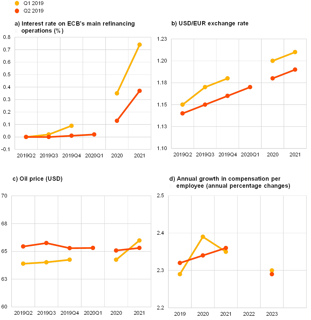 US dollar-denominated oil prices (per barrel) were expected to average $65.5 for 2019, $65.1 for 2020 and $65.3 for 2021, thus remaining stable across all horizons. This implies that forecasters now expect prices to be between 1.3% and 2.7% higher at all horizons except the longer term than they had expected in the previous survey (see panel (c) of Chart 12). When combined with expectations of a slight weakening – between 0.9% and 2.3% - in the USD/EUR exchange rate, these results imply a profile for the oil price in euro that is around 3.0% higher relative to the previous survey.