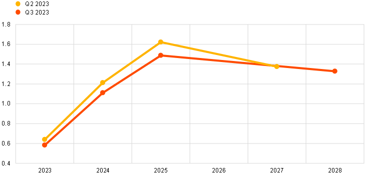 1) Longer-term expectations refer to 2028. In the ECB SPF round in the second quarter of 2023 they referred to 2027.